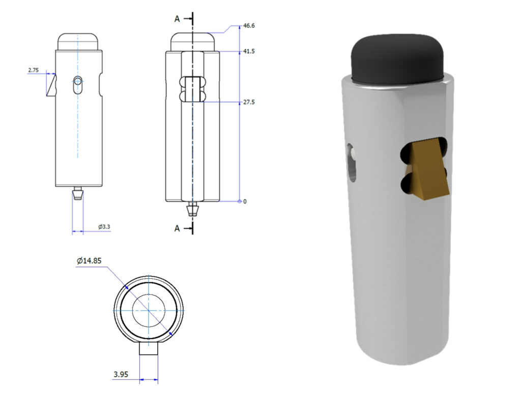 The developed locking unit has a diameter of 15 mm and is made from a combination of aluminium, plastic, and brass. This material selection provides a good balance between strength, low weight, and wear resistance.